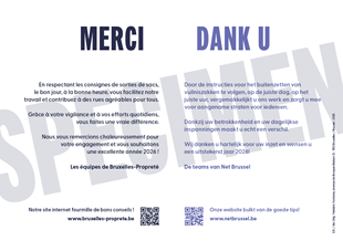 - De personeelsleden van Net Brussel zijn in het bezit van een officieel document ter bewijs dat ze bij Net Brussel werken. Het gaat om een wenskaart met enkele tips over het buitenzetten van de zakken en het plaatsen van het afval op de stoep.